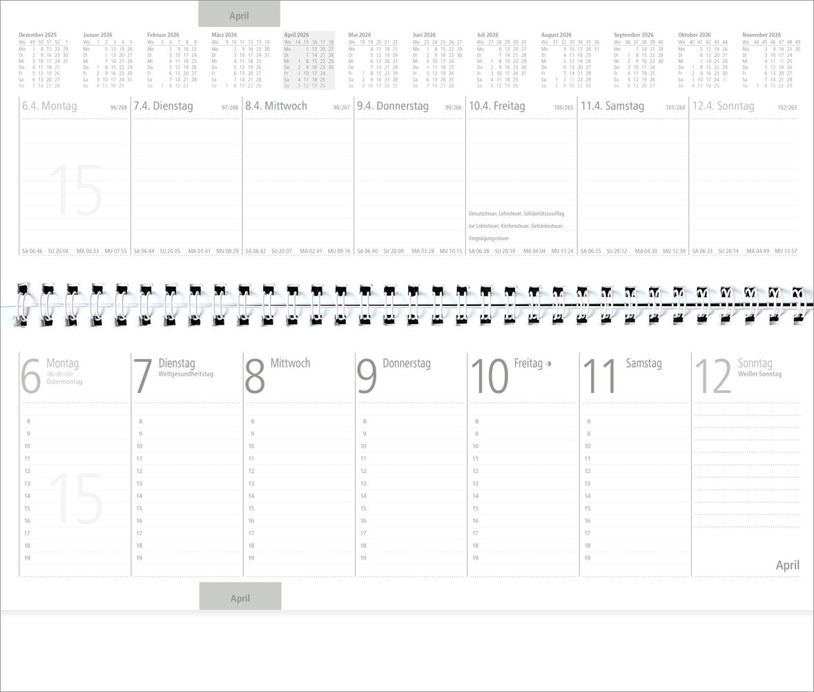 Thanks to the practical ring binding, you can quickly and easily turn the pages and always keep track of your weekly schedule. The generous layout offers plenty of space for appointments and notes so you won't miss any important events.